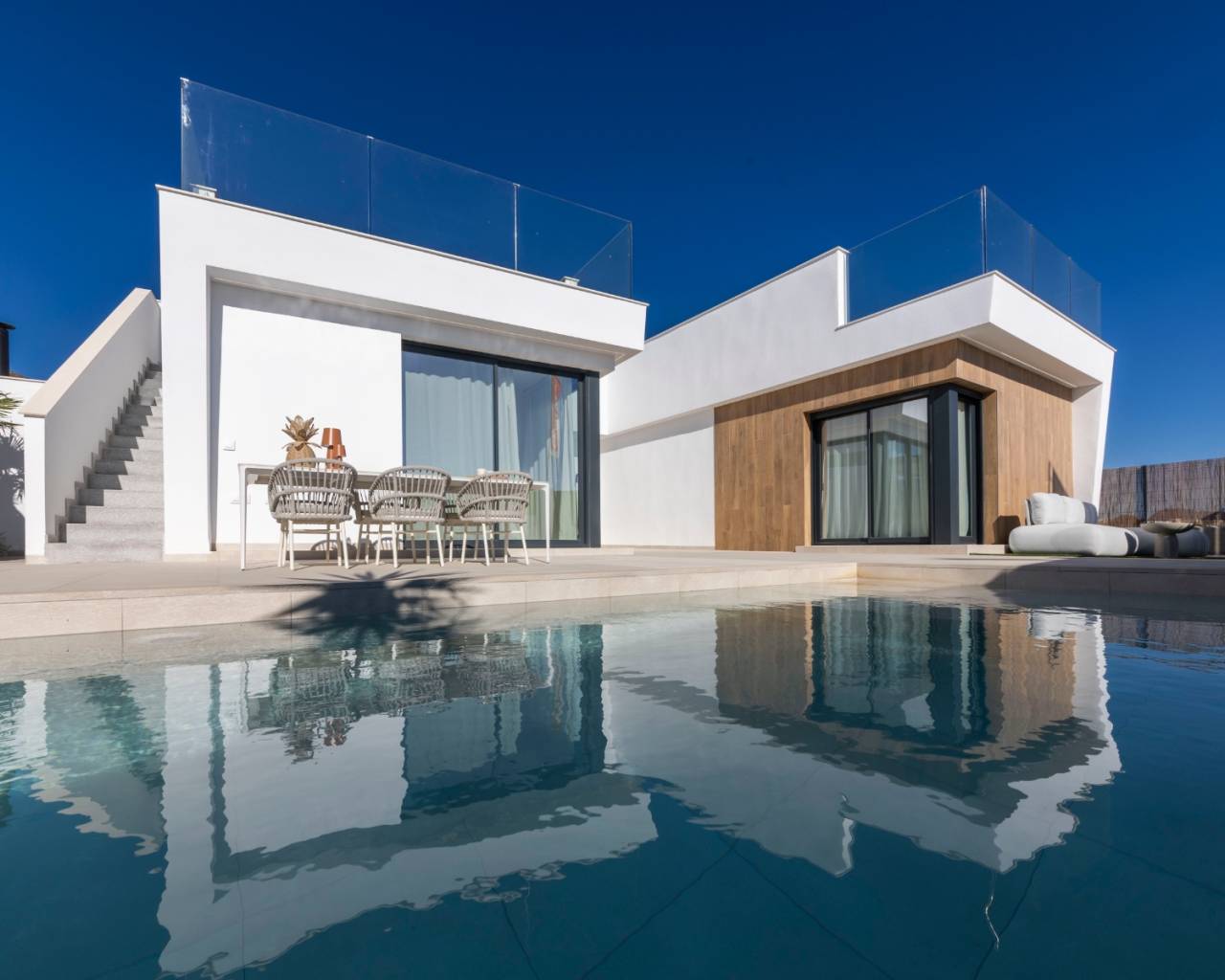 Each villa is built on a private plot starting from 300 m2, offering ample outdoor space to enjoy the sunshine all year round. The properties include a private swimming pool, landscaped garden areas and on plot parking.